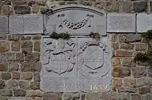Armoiries de Pierre le Tassier et Nicolas de Bruxelles, bourgmestres de Thuin en 1638-1639. Face sud du beffroi de Thuin.