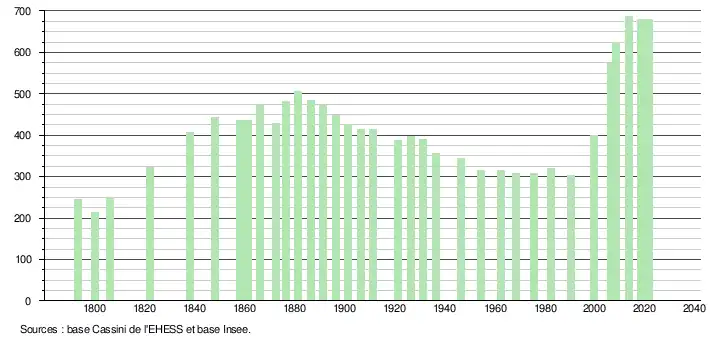 L'évolution du nombre d'habitants est connue à travers les recensements de la population effectués dans la commune depuis 1793. Pour les communes de moins de 10 000 habitants, une enquête de recensement portant sur toute la population est réalisée tous les cinq ans, les populations légales des années intermédiaires étant quant à elles estimées par interpolation ou extrapolation[15]. Pour la commune, le premier recensement exhaustif entrant dans le cadre du nouveau dispositif a été réalisé en 2008[16].