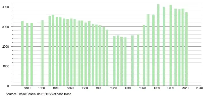 En 2021, la commune comptait 3 728 habitants[Note 3], en diminution de 4,31 % par rapport à 2015 (Indre-et-Loire : +1,19 %, France hors Mayotte : +1,84 %).