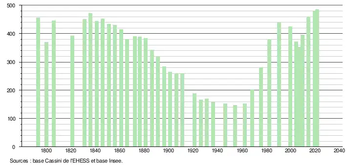 L'évolution du nombre d'habitants est connue à travers les recensements de la population effectués dans la commune depuis 1793. Pour les communes de moins de 10 000 habitants, une enquête de recensement portant sur toute la population est réalisée tous les cinq ans, les populations légales des années intermédiaires étant quant à elles estimées par interpolation ou extrapolation[21]. Pour la commune, le premier recensement exhaustif entrant dans le cadre du nouveau dispositif a été réalisé en 2004[22].