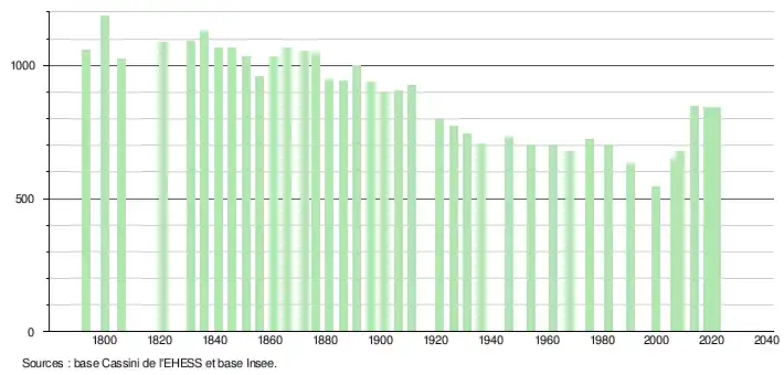 L'évolution du nombre d'habitants est connue à travers les recensements de la population effectués dans la commune depuis 1793. Pour les communes de moins de 10 000 habitants, une enquête de recensement portant sur toute la population est réalisée tous les cinq ans, les populations légales des années intermédiaires étant quant à elles estimées par interpolation ou extrapolation[30]. Pour la commune, le premier recensement exhaustif entrant dans le cadre du nouveau dispositif a été réalisé en 2008[31].