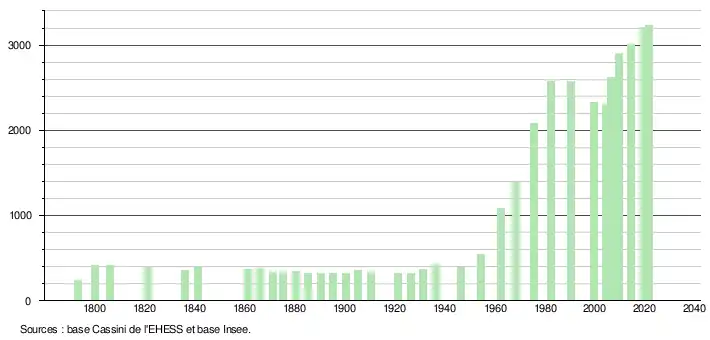 L'évolution du nombre d'habitants est connue à travers les recensements de la population effectués dans la commune depuis 1793. Pour les communes de moins de 10 000 habitants, une enquête de recensement portant sur toute la population est réalisée tous les cinq ans, les populations légales des années intermédiaires étant quant à elles estimées par interpolation ou extrapolation[23]. Pour la commune, le premier recensement exhaustif entrant dans le cadre du nouveau dispositif a été réalisé en 2004[24].