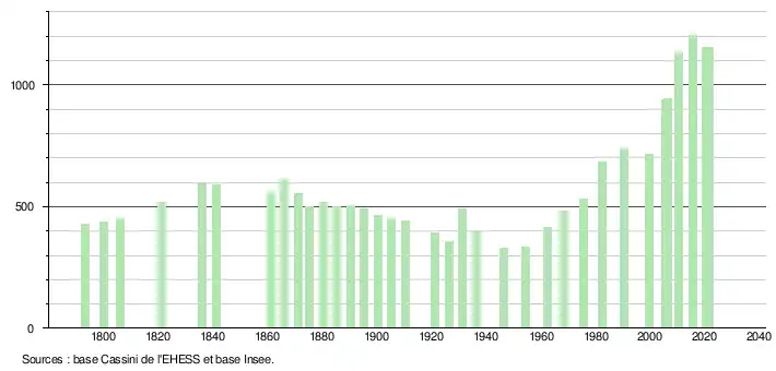 L'évolution du nombre d'habitants est connue à travers les recensements de la population effectués dans la commune depuis 1793. Pour les communes de moins de 10 000 habitants, une enquête de recensement portant sur toute la population est réalisée tous les cinq ans, les populations légales des années intermédiaires étant quant à elles estimées par interpolation ou extrapolation[19]. Pour la commune, le premier recensement exhaustif entrant dans le cadre du nouveau dispositif a été réalisé en 2005[20].