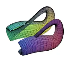 - En la coupant en deux par rapport à son plan de symétrie, on obtient deux fois un ruban de Möbius.