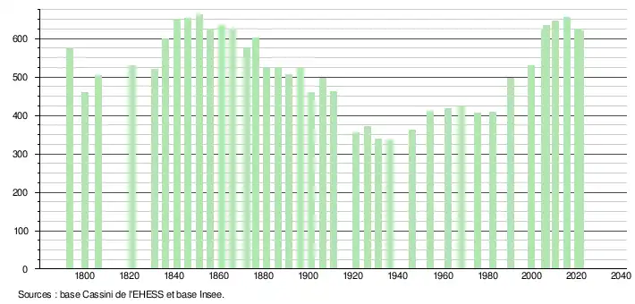L'évolution du nombre d'habitants est connue à travers les recensements de la population effectués dans la commune depuis 1793. Pour les communes de moins de 10 000 habitants, une enquête de recensement portant sur toute la population est réalisée tous les cinq ans, les populations légales des années intermédiaires étant quant à elles estimées par interpolation ou extrapolation[27]. Pour la commune, le premier recensement exhaustif entrant dans le cadre du nouveau dispositif a été réalisé en 2005[28].