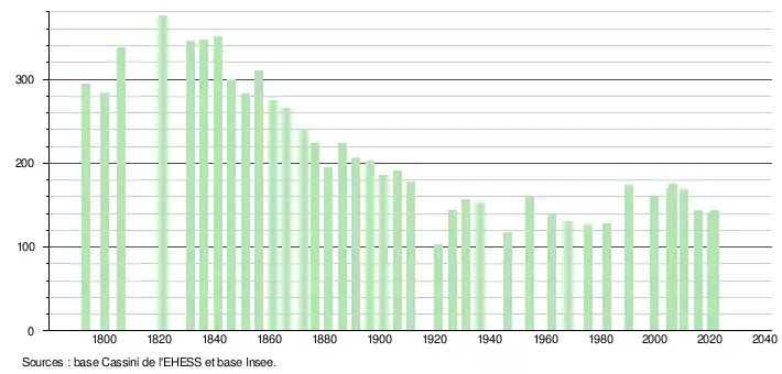 L'évolution du nombre d'habitants est connue à travers les recensements de la population effectués dans la commune depuis 1793. Pour les communes de moins de 10 000 habitants, une enquête de recensement portant sur toute la population est réalisée tous les cinq ans, les populations légales des années intermédiaires étant quant à elles estimées par interpolation ou extrapolation[18]. Pour la commune, le premier recensement exhaustif entrant dans le cadre du nouveau dispositif a été réalisé en 2005[19].