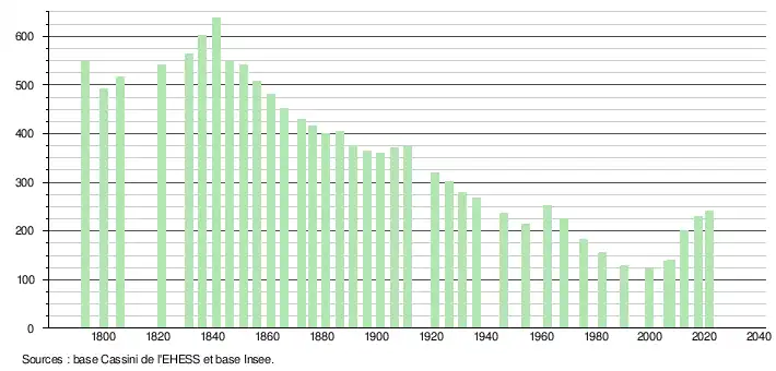 L'évolution du nombre d'habitants est connue à travers les recensements de la population effectués dans la commune depuis 1793. Pour les communes de moins de 10 000 habitants, une enquête de recensement portant sur toute la population est réalisée tous les cinq ans, les populations légales des années intermédiaires étant quant à elles estimées par interpolation ou extrapolation[20]. Pour la commune, le premier recensement exhaustif entrant dans le cadre du nouveau dispositif a été réalisé en 2007[21].