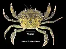 L'évolution morphologique vers une forme de crabe est un processus évolutif chez les crustacés, appelé carcinisation ou brachyourisation. Il correspond à l'acquisition d'une carapace entièrement calcifiée[19], d'un plastron sternal résultant de la fusion des sternites au niveau ventral, d'une réduction du pléon (l'abdomen) atrophique replié sous le céphalothorax, et l'acquisition de la brachygnathie (en) (cadre buccal large et limité en avant)[20].
