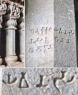 Pilier gauche No.9 de la Grande Chatya à Grottes de Karla. Ce pilier fut dédicacé par un Yavana (Indo-Grec), vers 120 EC, de même que cinq autres piliers. L'inscription en Brahmi se lit : Dhenukakata Yavanasa/ Yasavadhanana[m]/ thabo dana[m] c.a.d. "(Ce) pilier (est) un don du Yavana Yasavadhana de Denukakata"[1]. En bas : détail du mot "Ya-va-na-sa" (adjectif du nom "Yavana", en Brahmi).