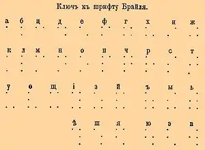 Alphabet braille cyrillique dans l’encyclopédie Brockhaus et Efron (vers 1900)