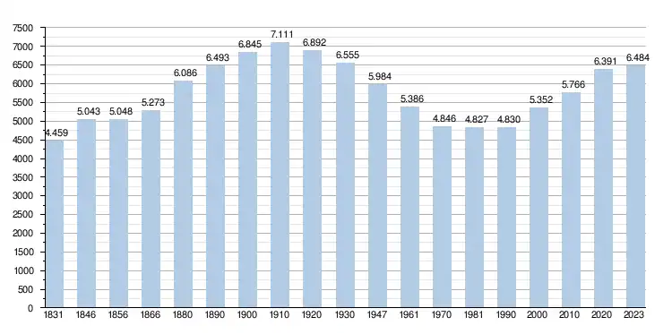 Les chiffres des années 1831 à 1970 tiennent compte des chiffres des anciennes communes fusionnées.