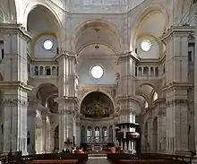 Au-dessus de la croisée formée par les larges transepts, s'élève une coupole à caissons.