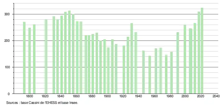 L'évolution du nombre d'habitants est connue à travers les recensements de la population effectués dans la commune depuis 1793. Pour les communes de moins de 10 000 habitants, une enquête de recensement portant sur toute la population est réalisée tous les cinq ans, les populations légales des années intermédiaires étant quant à elles estimées par interpolation ou extrapolation[17]. Pour la commune, le premier recensement exhaustif entrant dans le cadre du nouveau dispositif a été réalisé en 2007[18].