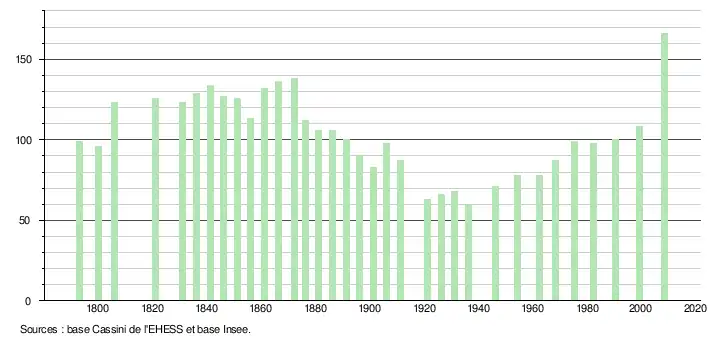 L'évolution du nombre d'habitants est connue à travers les recensements de la population effectués dans la commune depuis 1793. À partir du , les populations légales des communes sont publiées annuellement dans le cadre d'un recensement qui repose désormais sur une collecte d'information annuelle, concernant successivement tous les territoires communaux au cours d'une période de cinq ans. Pour les communes de moins de 10 000 habitants, une enquête de recensement portant sur toute la population est réalisée tous les cinq ans, les populations légales des années intermédiaires étant quant à elles estimées par interpolation ou extrapolation[14]. Pour la commune, le premier recensement exhaustif entrant dans le cadre du nouveau dispositif a été réalisé en 2008[15],[Note 2].