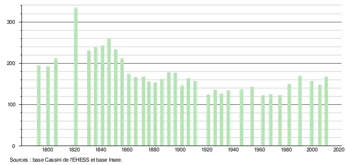 L'évolution du nombre d'habitants est connue à travers les recensements de la population effectués dans la commune depuis 1793. À partir du , les populations légales des communes sont publiées annuellement dans le cadre d'un recensement qui repose désormais sur une collecte d'information annuelle, concernant successivement tous les territoires communaux au cours d'une période de cinq ans. Pour les communes de moins de 10 000 habitants, une enquête de recensement portant sur toute la population est réalisée tous les cinq ans, les populations légales des années intermédiaires étant quant à elles estimées par interpolation ou extrapolation[15]. Pour la commune, le premier recensement exhaustif entrant dans le cadre du nouveau dispositif a été réalisé en 2005[16],[Note 3].