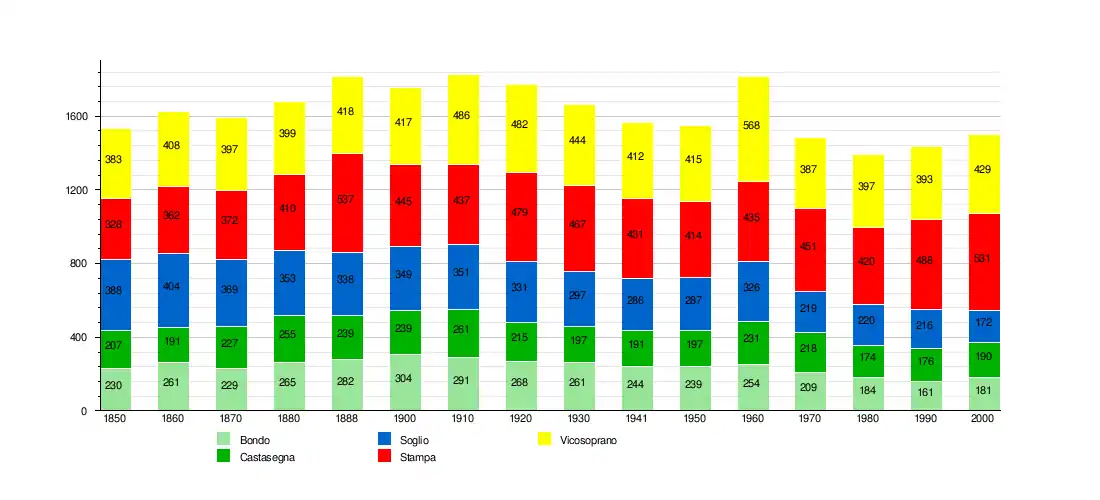 La commune est composée des localités de Bondo, Borgonovo, Castasegna, Coltura, Maloja, Montaccio, Soglio, Stampa, Vicosoprano. Le chef-lieu de la commune se situe dans la localité de Stampa ; le siège municipal est à Promontogno.