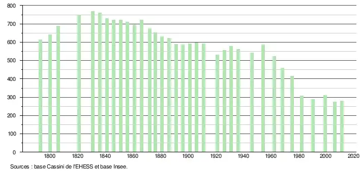 L'évolution du nombre d'habitants est connue à travers les recensements de la population effectués dans la commune depuis 1793. À partir du , les populations légales des communes sont publiées annuellement dans le cadre d'un recensement qui repose désormais sur une collecte d'information annuelle, concernant successivement tous les territoires communaux au cours d'une période de cinq ans. Pour les communes de moins de 10 000 habitants, une enquête de recensement portant sur toute la population est réalisée tous les cinq ans, les populations légales des années intermédiaires étant quant à elles estimées par interpolation ou extrapolation[27]. Pour la commune, le premier recensement exhaustif entrant dans le cadre du nouveau dispositif a été réalisé en 2006[28],[Note 1].