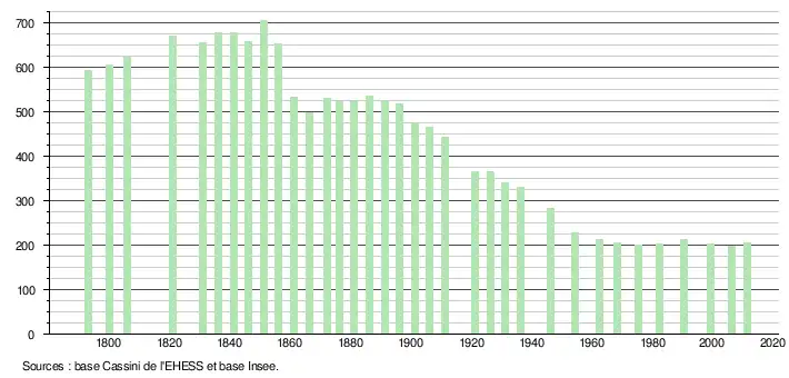 L'évolution du nombre d'habitants est connue à travers les recensements de la population effectués dans la commune depuis 1793. À partir du , les populations légales des communes sont publiées annuellement dans le cadre d'un recensement qui repose désormais sur une collecte d'information annuelle, concernant successivement tous les territoires communaux au cours d'une période de cinq ans. Pour les communes de moins de 10 000 habitants, une enquête de recensement portant sur toute la population est réalisée tous les cinq ans, les populations légales des années intermédiaires étant quant à elles estimées par interpolation ou extrapolation[5]. Pour la commune, le premier recensement exhaustif entrant dans le cadre du nouveau dispositif a été réalisé en 2006[6],[Note 1].