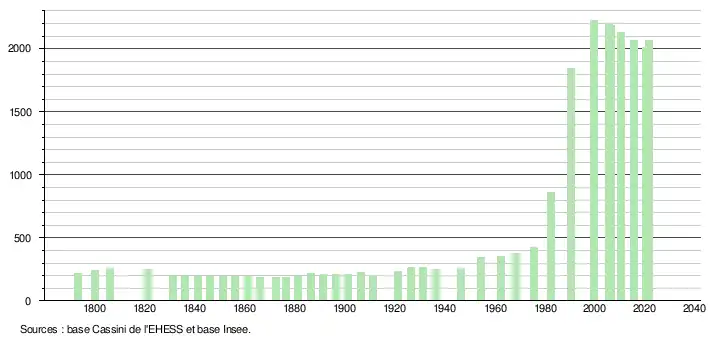 L'évolution du nombre d'habitants est connue à travers les recensements de la population effectués dans la commune depuis 1793. Pour les communes de moins de 10 000 habitants, une enquête de recensement portant sur toute la population est réalisée tous les cinq ans, les populations légales des années intermédiaires étant quant à elles estimées par interpolation ou extrapolation[37]. Pour la commune, le premier recensement exhaustif entrant dans le cadre du nouveau dispositif a été réalisé en 2005[38].