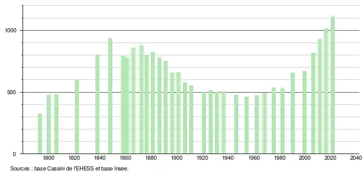 L'évolution du nombre d'habitants est connue à travers les recensements de la population effectués dans la commune depuis 1793. Pour les communes de moins de 10 000 habitants, une enquête de recensement portant sur toute la population est réalisée tous les cinq ans, les populations légales des années intermédiaires étant quant à elles estimées par interpolation ou extrapolation[19]. Pour la commune, le premier recensement exhaustif entrant dans le cadre du nouveau dispositif a été réalisé en 2006[20].