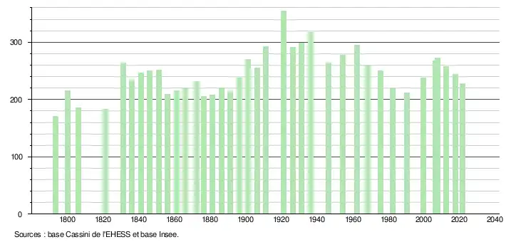 L'évolution du nombre d'habitants est connue à travers les recensements de la population effectués dans la commune depuis 1793. Pour les communes de moins de 10 000 habitants, une enquête de recensement portant sur toute la population est réalisée tous les cinq ans, les populations légales des années intermédiaires étant quant à elles estimées par interpolation ou extrapolation[35]. Pour la commune, le premier recensement exhaustif entrant dans le cadre du nouveau dispositif a été réalisé en 2007[36].