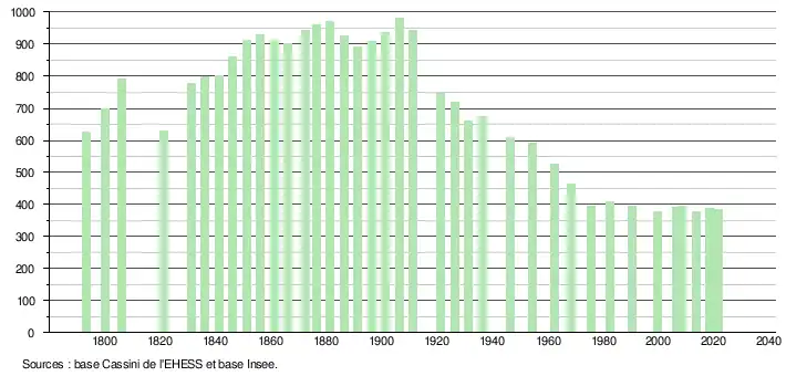 L'évolution du nombre d'habitants est connue à travers les recensements de la population effectués dans la commune depuis 1793. Pour les communes de moins de 10 000 habitants, une enquête de recensement portant sur toute la population est réalisée tous les cinq ans, les populations légales des années intermédiaires étant quant à elles estimées par interpolation ou extrapolation[23]. Pour la commune, le premier recensement exhaustif entrant dans le cadre du nouveau dispositif a été réalisé en 2008[24].