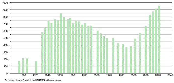 L'évolution du nombre d'habitants est connue à travers les recensements de la population effectués dans la commune depuis 1793. Pour les communes de moins de 10 000 habitants, une enquête de recensement portant sur toute la population est réalisée tous les cinq ans, les populations légales des années intermédiaires étant quant à elles estimées par interpolation ou extrapolation[22]. Pour la commune, le premier recensement exhaustif entrant dans le cadre du nouveau dispositif a été réalisé en 2006[23].