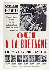Le processus de régionalisation est relancé par le pouvoir lors du référendum de 1969 dont l'une des questions porte sur la question de la décentralisation. La population bretonne soutient largement ce processus, contrairement au reste de la France. Cependant la loi no 72-619 du , « portant création et organisation des régions » instaure un Conseil régional de Bretagne, duquel est exclu le département de la Loire-Atlantique, certains notables cherchant ainsi à préserver leurs fiefs[28]. Ces entités deviennent officiellement des Établissements publics régionaux, disposent de compétences limitées à l'économie, et sont placées sous l'autorité du préfet de région[29]. L'ancien président du CELIB René Pleven en devient le premier président, et ses membres sont pour moitié nommés, et pour moitié élus[30]. Le périmètre choisis, excluant le département de la Loire-Atlantique rencontre une certaine opposition, et des manifestations sont organisées dès 1976 pour aboutir à une région à cinq départements. Le tracés est cependant confirmé en 1982 lors de la réforme suivante. La région récupère de plus des compétences culturelles en 1977 dans le cadre l'adoption de la Charte culturelle bretonne sous la présidence de Valéry Giscard d'Estaing[31].