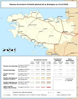 Le TER Bretagne compte treize lignes et couvre 1 193 km. Il est structuré par trois lignes majeures au départ de Rennes, et à destination de Quimper, Brest et Saint-Malo. Ces lignes sont parcourues par des TGV au départ de Paris ou Lille. Rennes n'est qu'à 1 h 25 de Paris et les TGV les plus rapides relient Brest à la capitale en 3 h 24[3].