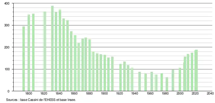 L'évolution du nombre d'habitants est connue à travers les recensements de la population effectués dans la commune depuis 1793. Pour les communes de moins de 10 000 habitants, une enquête de recensement portant sur toute la population est réalisée tous les cinq ans, les populations légales des années intermédiaires étant quant à elles estimées par interpolation ou extrapolation[10]. Pour la commune, le premier recensement exhaustif entrant dans le cadre du nouveau dispositif a été réalisé en 2005[11].