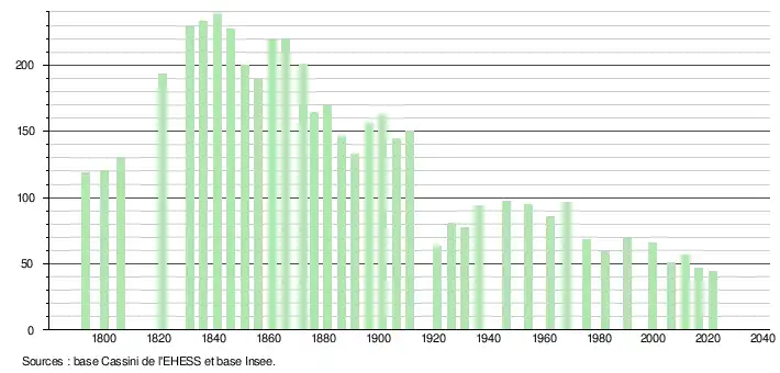 L'évolution du nombre d'habitants est connue à travers les recensements de la population effectués dans la commune depuis 1793. Pour les communes de moins de 10 000 habitants, une enquête de recensement portant sur toute la population est réalisée tous les cinq ans, les populations légales des années intermédiaires étant quant à elles estimées par interpolation ou extrapolation[30]. Pour la commune, le premier recensement exhaustif entrant dans le cadre du nouveau dispositif a été réalisé en 2006[31].