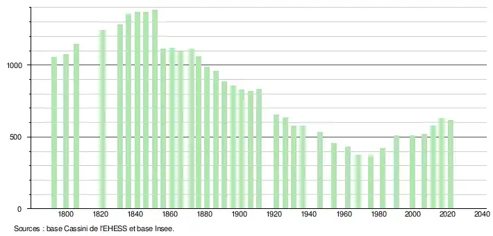 L'évolution du nombre d'habitants est connue à travers les recensements de la population effectués dans la commune depuis 1793. Pour les communes de moins de 10 000 habitants, une enquête de recensement portant sur toute la population est réalisée tous les cinq ans, les populations légales des années intermédiaires étant quant à elles estimées par interpolation ou extrapolation[25]. Pour la commune, le premier recensement exhaustif entrant dans le cadre du nouveau dispositif a été réalisé en 2006[26].