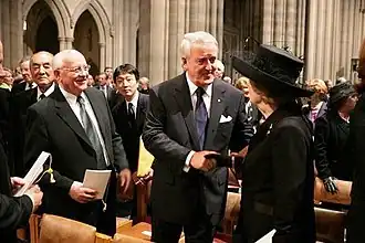 Mikhail Gorbatchev, Brian Mulroney et Margaret Thatcher, le en la cathédrale de Washington lors des funérailles de Ronald Reagan.