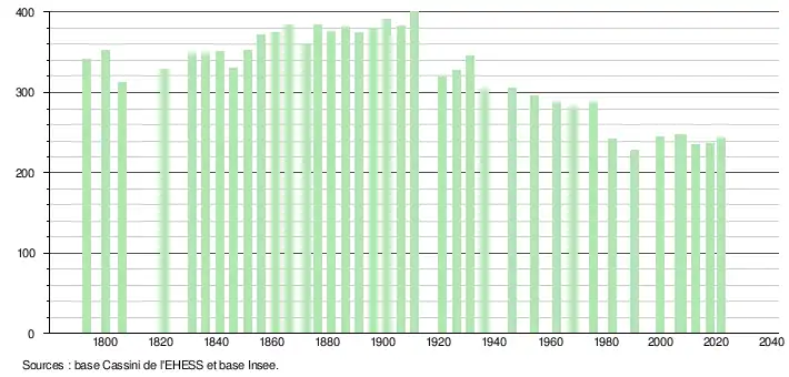 L'évolution du nombre d'habitants est connue à travers les recensements de la population effectués dans la commune depuis 1793. Pour les communes de moins de 10 000 habitants, une enquête de recensement portant sur toute la population est réalisée tous les cinq ans, les populations légales des années intermédiaires étant quant à elles estimées par interpolation ou extrapolation[20]. Pour la commune, le premier recensement exhaustif entrant dans le cadre du nouveau dispositif a été réalisé en 2007[21].