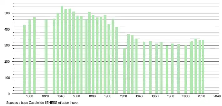 L'évolution du nombre d'habitants est connue à travers les recensements de la population effectués dans la commune depuis 1793. Pour les communes de moins de 10 000 habitants, une enquête de recensement portant sur toute la population est réalisée tous les cinq ans, les populations légales des années intermédiaires étant quant à elles estimées par interpolation ou extrapolation[19]. Pour la commune, le premier recensement exhaustif entrant dans le cadre du nouveau dispositif a été réalisé en 2007[20].
