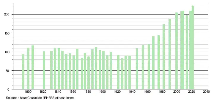 L'évolution du nombre d'habitants est connue à travers les recensements de la population effectués dans la commune depuis 1793. Pour les communes de moins de 10 000 habitants, une enquête de recensement portant sur toute la population est réalisée tous les cinq ans, les populations légales des années intermédiaires étant quant à elles estimées par interpolation ou extrapolation[22]. Pour la commune, le premier recensement exhaustif entrant dans le cadre du nouveau dispositif a été réalisé en 2008[23].