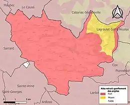 Le retrait-gonflement des sols argileux est susceptible d'engendrer des dommages importants aux bâtiments en cas d’alternance de périodes de sécheresse et de pluie. 99,6 % de la superficie communale est en aléa moyen ou fort (88,8 % au niveau départemental et 48,5 % au niveau national). Sur les 195 bâtiments dénombrés sur la commune en 2019, 194 sont en aléa moyen ou fort, soit 99 %, à comparer aux 98 % au niveau départemental et 54 % au niveau national. Une cartographie de l'exposition du territoire national au retrait gonflement des sols argileux est disponible sur le site du BRGM[23],[Carte 1].