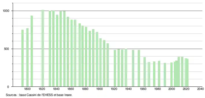 L'évolution du nombre d'habitants est connue à travers les recensements de la population effectués dans la commune depuis 1793. Pour les communes de moins de 10 000 habitants, une enquête de recensement portant sur toute la population est réalisée tous les cinq ans, les populations légales des années intermédiaires étant quant à elles estimées par interpolation ou extrapolation[29]. Pour la commune, le premier recensement exhaustif entrant dans le cadre du nouveau dispositif a été réalisé en 2004[30].