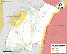 Les mouvements de terrains susceptibles de se produire sur la commune sont des tassements différentiels[16]. Le retrait-gonflement des sols argileux est susceptible d'engendrer des dommages importants aux bâtiments en cas d’alternance de périodes de sécheresse et de pluie[17]. 11,8 % de la superficie communale est en aléa moyen ou fort (54,9 % au niveau départemental et 48,5 % au niveau national)[Carte 2]. Depuis le , en application de la loi ELAN, différentes contraintes s'imposent aux vendeurs, maîtres d'ouvrages ou constructeurs de biens situés dans une zone classée en aléa moyen ou fort[Note 3],[18].