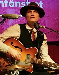 Bror Gunnar Jansson est un one man band ou homme orchestre puisque sur scène il joue de la guitare et de la batterie en même temps.