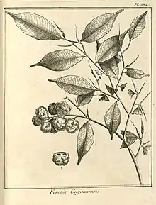 J'ai trouvé un ſeul de ces arbres chargé de fruit, au mois de Mai, dans la forêt qui eſt près du ſault de la rivière d'Aroura. »