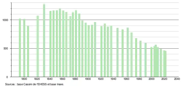 L'évolution du nombre d'habitants est connue à travers les recensements de la population effectués dans la commune depuis 1793. Pour les communes de moins de 10 000 habitants, une enquête de recensement portant sur toute la population est réalisée tous les cinq ans, les populations légales des années intermédiaires étant quant à elles estimées par interpolation ou extrapolation[39]. Pour la commune, le premier recensement exhaustif entrant dans le cadre du nouveau dispositif a été réalisé en 2004[40].