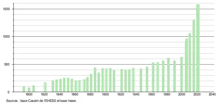 L'évolution du nombre d'habitants est connue à travers les recensements de la population effectués dans la commune depuis 1793. Pour les communes de moins de 10 000 habitants, une enquête de recensement portant sur toute la population est réalisée tous les cinq ans, les populations légales des années intermédiaires étant quant à elles estimées par interpolation ou extrapolation[38]. Pour la commune, le premier recensement exhaustif entrant dans le cadre du nouveau dispositif a été réalisé en 2005[39].
