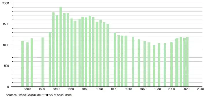 L'évolution du nombre d'habitants est connue à travers les recensements de la population effectués dans la commune depuis 1793. Pour les communes de moins de 10 000 habitants, une enquête de recensement portant sur toute la population est réalisée tous les cinq ans, les populations légales des années intermédiaires étant quant à elles estimées par interpolation ou extrapolation[26]. Pour la commune, le premier recensement exhaustif entrant dans le cadre du nouveau dispositif a été réalisé en 2007[27].