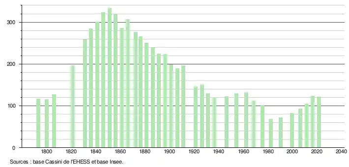 L'évolution du nombre d'habitants est connue à travers les recensements de la population effectués dans la commune depuis 1793. Pour les communes de moins de 10 000 habitants, une enquête de recensement portant sur toute la population est réalisée tous les cinq ans, les populations légales des années intermédiaires étant quant à elles estimées par interpolation ou extrapolation[27]. Pour la commune, le premier recensement exhaustif entrant dans le cadre du nouveau dispositif a été réalisé en 2006[28].