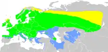 La limite méridionale de sa distribution passe par le nord de l'Espagne, le sud de la France, l'Italie (Latium et Calabre), les pays de l'ex-Yougoslavie et la Hongrie. Au nord, cet oiseau se reproduit jusqu'au 70e parallèle nord de latitude en Norvège et en Finlande.