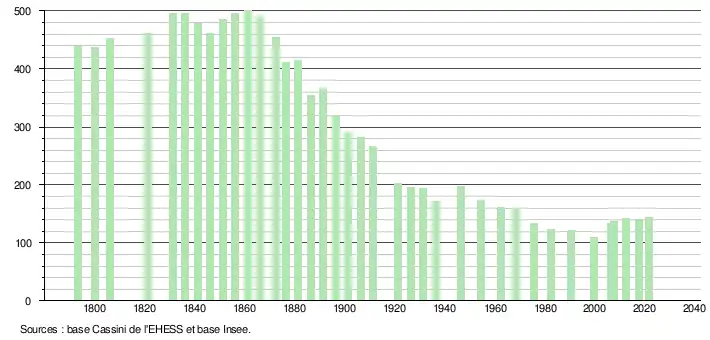 L'évolution du nombre d'habitants est connue à travers les recensements de la population effectués dans la commune depuis 1793. Pour les communes de moins de 10 000 habitants, une enquête de recensement portant sur toute la population est réalisée tous les cinq ans, les populations légales des années intermédiaires étant quant à elles estimées par interpolation ou extrapolation[23]. Pour la commune, le premier recensement exhaustif entrant dans le cadre du nouveau dispositif a été réalisé en 2007[24].