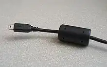 Un noyau de ferrite à l'extrémité d'un câble informatique, servant à supprimer le bruit de mesure à haute fréquence.
