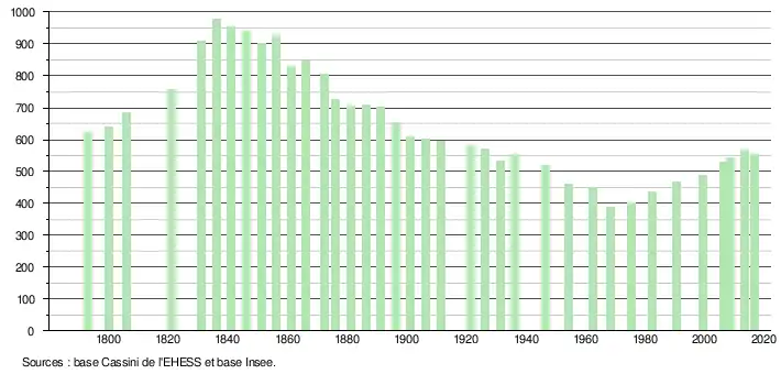 L'évolution du nombre d'habitants est connue à travers les recensements de la population effectués dans la commune depuis 1793. Pour les communes de moins de 10 000 habitants, une enquête de recensement portant sur toute la population est réalisée tous les cinq ans, les populations légales des années intermédiaires étant quant à elles estimées par interpolation ou extrapolation[8]. Pour la commune, le premier recensement exhaustif entrant dans le cadre du nouveau dispositif a été réalisé en 2008[9].