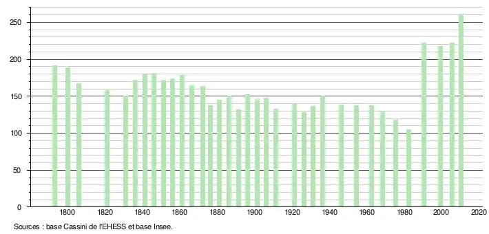 L'évolution du nombre d'habitants est connue à travers les recensements de la population effectués dans la commune depuis 1793. À partir du , les populations légales des communes sont publiées annuellement dans le cadre d'un recensement qui repose désormais sur une collecte d'information annuelle, concernant successivement tous les territoires communaux au cours d'une période de cinq ans. Pour les communes de moins de 10 000 habitants, une enquête de recensement portant sur toute la population est réalisée tous les cinq ans, les populations légales des années intermédiaires étant quant à elles estimées par interpolation ou extrapolation[9]. Pour la commune, le premier recensement exhaustif entrant dans le cadre du nouveau dispositif a été réalisé en 2005[10],[Note 1].